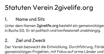2givelife.org is a non-profit association within the scope of Art. 60 et. seq. of the Swiss Civil Code. The headquarters are in Buchs SG. It is politically and denominationally independent.